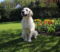 Aus LUNA's letztem Wurf (D-Wurf) wollten wir gerne eine kleine Hündin behalten und unsere Wahl fiel auf die süße Plüschnase mit dem lila Punkt. NALA blieb bei uns und verzaubert uns seitdem mit ihrer immer fröhlichen Art. Von Anfang an war sie eine sehr verspielte Hündin mit viel Selbstbewusstsein und einem ausgeprägten Will-to-please. NALA präsentiert sich sehr gern auf Austellungen und arbeitet bereits ziemlich gut beim Dummy-Trai-ning auf dem DRC-Platz. Wie es sich für einen typischen Golden gehört, liebt sie Wasser und unsere Ausflüge zum See.